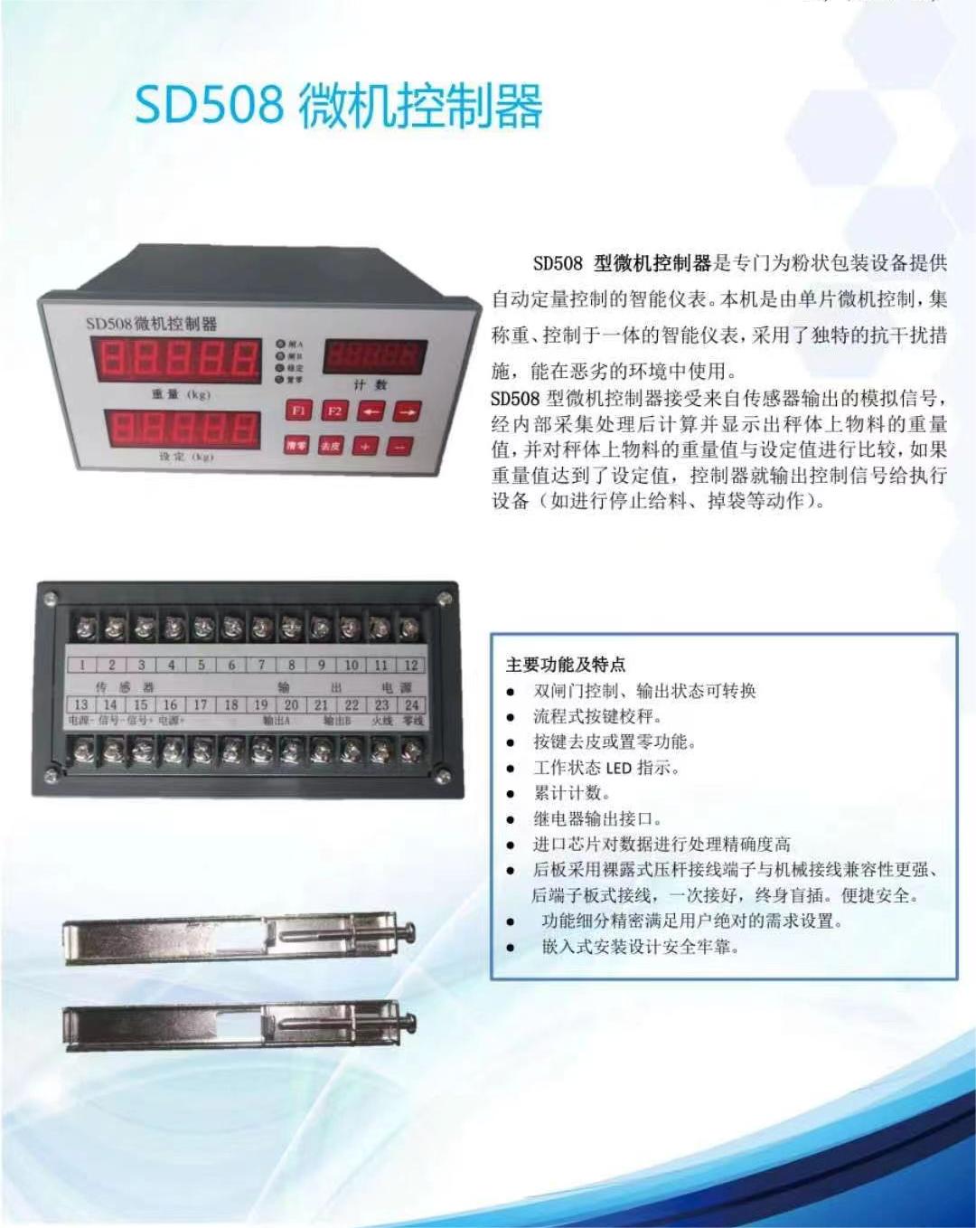 SD508型微機控制器接受來自傳感器輸出的模擬信號,經(jīng)內(nèi)部采集處理后計算并顯示出秤體上物料的重量值,并對秤體上物料的重量值與設(shè)定值進(jìn)行比較,如果重量值達(dá)到了設(shè)定值,控制器就輸出控制信號給執(zhí)行設(shè)備(如進(jìn)行停止給料、掉袋等動作)。KVS廣州南創(chuàng)電子科技有限公司