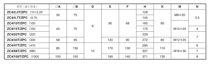 類型/最大容量( E max ) ZC4 C3/1t ~ 470t